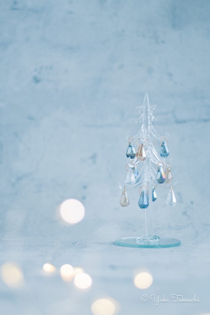 自然光の静かな光の中に、玉ボケのふんわりした温かい光を少しだけ足すことで、冷たすぎない、優しいクリスマスの雰囲気を作りました。