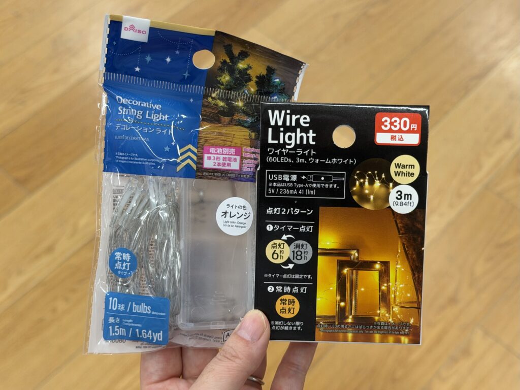 110円で買える、デコレーションライト(写真左側)はコードが太いので、ライトとライトの間の線が、ぼかしたとしても写真に写り込んで目立ちます。
